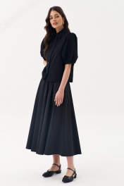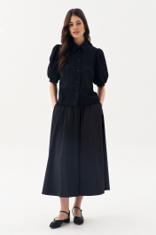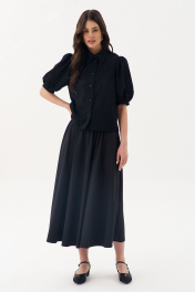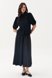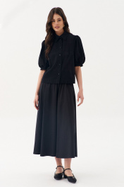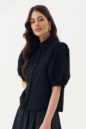 Блузка свободного силуэта: •рукав "фонарик" с притачной манжетой •рубашечный воротник со стойкой •застежка на петли-пуговицы •по спинке кокетка