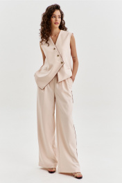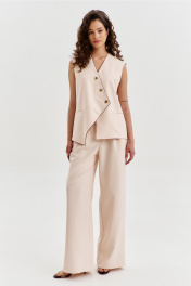 Комплект, состоящий из жилетки и брюк. Жилетка свободного кроя, длиной чуть выше линии бедер, с ассиметричной линией низа. Спинка с ассиметричным швом. Перед с прорезными карманами с листочкой. Застежка ассиметричная на петли и пуговицы. Жилетка на подкладке. Брюки длинные, широкие. По задним половинкам талиевые вытачки. По передним половинкам односторонние складки, боковые карманы и застежка на тесьму-«молнию» с гульфиком и откоском. Брюки на притачном поясе, по спинке с резинкой. По поясу вставлены шлевки.