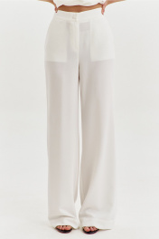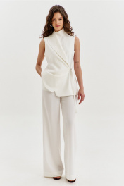 Комплект, состоящий из жилета и брюк. Жилет свободного кроя, длиной чуть ниже бедер. Спинка со средним швом. Перед ассиметричный: правый перед с воротником «апаш», левый перед с воротником стойка. Застежка двубортная на пояс с полукольцами. Жилет на подкладке. Брюки прямого силуэта, на притачном поясе с резинкой по спинке. По задним половинкам талиевые вытачки. По передним половинкам обработаны боковые карманы с наклонным входом, и застежка на тесьму-«молнию» с гульфиком и откоском. По поясу застежка на петлю и пуговицу.