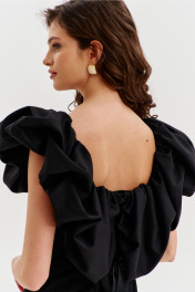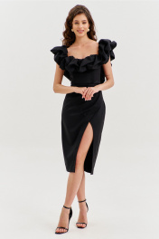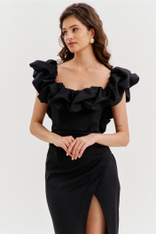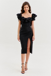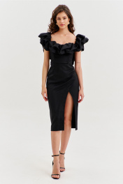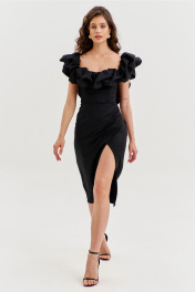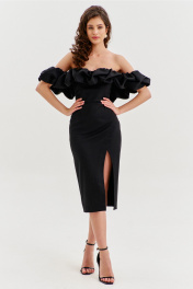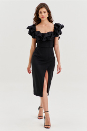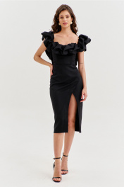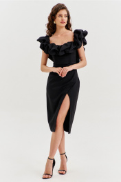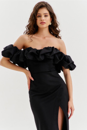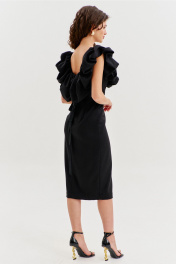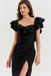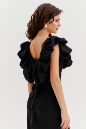 Платье прилегающего силуэта, длиной до середины икры. Платье отрезное по линии талии. Лиф платья выполнен в виде корсета со шнуровкой по спинке. Юбка спинки с талиевыми вытачками и средним швом, в котором обработана застежка на потайную тесьму-«молнию». Юбка переда выполнена на запах с ассиметричным разрезом. Платье с объемным декором в области груди, рук и спинки.