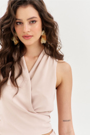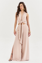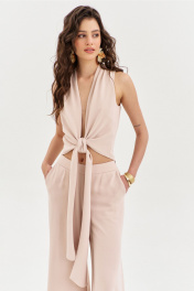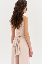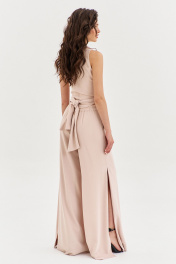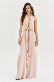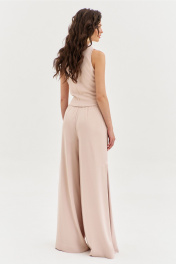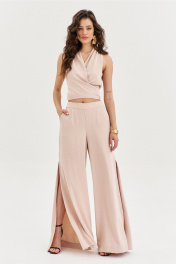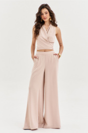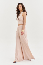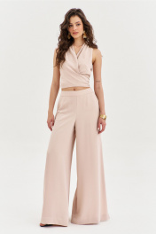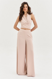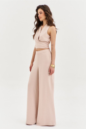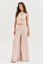 Комплект, состоящий из блузки и брюк. Блузка полуприлегающего силуэта, длиной по спинке чуть ниже линии талии. Спинка со средним швом. Перед с мягкими складками от плеча, с длинными завязками. Перед двойной из основной ткани. По горловине выполнена стойка. Брюки палаццо на притачном поясе с резинкой по спинке. По задним половинкам талиевые вытачки. По передним половинкам выполнены карманы с наклонным входом. В боковых швах высокие разрезы. Застежка на потайную тесьму-«молнию» в левом боковом шве.