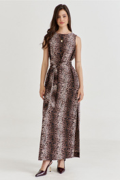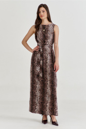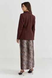 Костюм, состоящий из жакета и платья. Жакет полуприлегающего силуэта, длиной ниже линии бедер. Спинка со средним швом, в котором обработана шлица, с рельефами от пройм до низа. Перед с нагрудной вытачкой, рельефом и прорезным карманом «в рамку». Рукава двушовные, втачные, длинные. Воротник пиджачного типа с лацканом. Застежка на петлю и пуговицу. Жакет на подкладке. Платье свободного кроя, длиной макси. Спинка по горловине с разрезом, в котором обработана застежка на навесную петельку и пришивную пуговицу. По переду нагрудные вытачки. В боковых швах обработаны карманы и высокие разрезы. Горловина округлой формы, без воротника. Платье без рукавов. Платье дополняет съемный пояс.