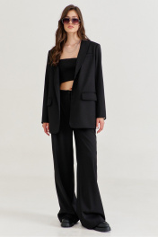 Костюм женский, состоящий из жакета и брюк. Жакет прямого силуэта, длиной ниже линии бедер. Спинка со средним швом, в котором обработана высокая шлица. По переду обработаны карманы «в рамку» с клапаном. В области груди на левом переде обработан карман-обманка с листочкой. Рукава длинные, двушовные, втачные. По низу рукава, в локтевом шве обработана шлица. Воротник пиджачного типа с лацканами. Застежка по переду на петлю и пуговицу. Жакет на подкладке, с плечевыми накладками. Брюки длинные, широкие. По задним половинкам талиевые вытачки. По передним половинкам односторонние складки, боковые карманы и застежка на тесьму-«молнию» с гульфиком и откоском. Брюки на притачном поясе, по спинке с резинкой. По поясу вставлены шлевки.