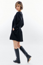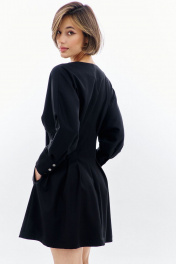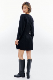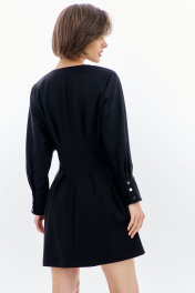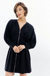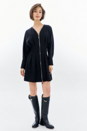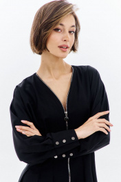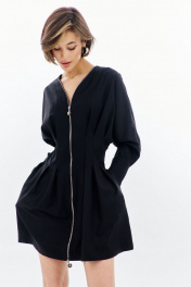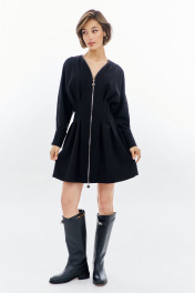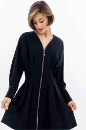 Платье полуприлегающего силуэта: -горловина V-образной формы, без воротника -застежка по переду на декоративную молнию -рукава покроя «летучая мышь», длиной 7/8 -по низу рукава складки, разрез и притачная манжета -по талии складки -в боковых швах карманы .