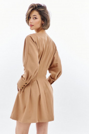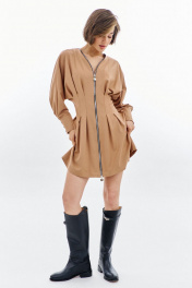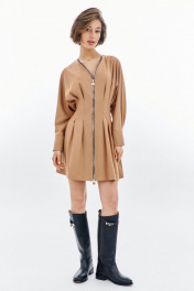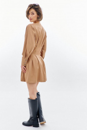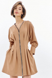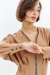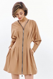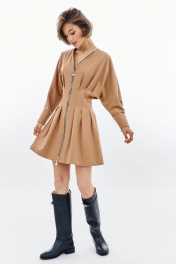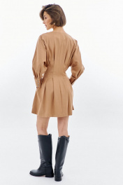 Платье полуприлегающего силуэта: -горловина V-образной формы, без воротника -застежка по переду на декоративную молнию -рукава покроя «летучая мышь», длиной 7/8 -по низу рукава складки, разрез и притачная манжета -по талии складки -в боковых швах карманы .