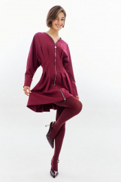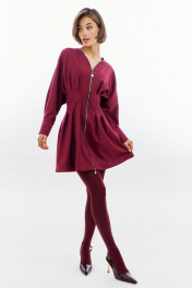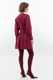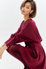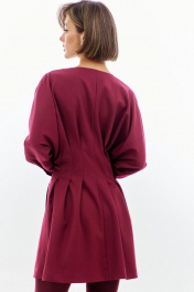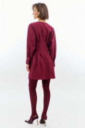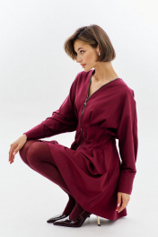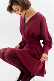 Платье полуприлегающего силуэта: -горловина V-образной формы, без воротника -застежка по переду на декоративную молнию -рукава покроя «летучая мышь», длиной 7/8 -по низу рукава складки, разрез и притачная манжета -по талии складки -в боковых швах карманы .