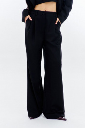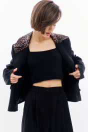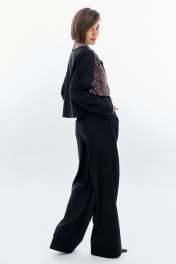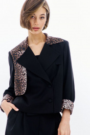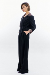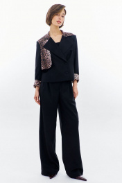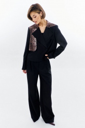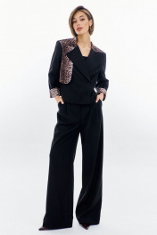 Костюм (жакета + брюки). Жакет двубортный прямого силуэта: -воротник пиджачного типа с лацканами -отлетная кокетка, воротник и обтачка рукава с леопардовым принтом -застежка на петли и пуговицы. - рукава втачные, длинные -на подкладке Брюки палаццо: - застежка на тесьму-молнию с гульфиком -карманы с наклонным входом -по спинке на резинке .