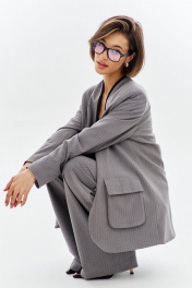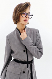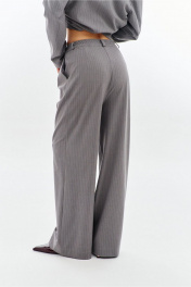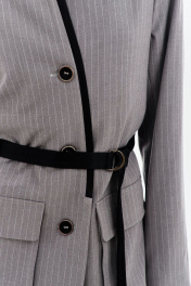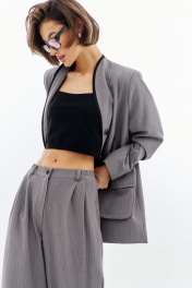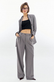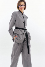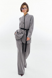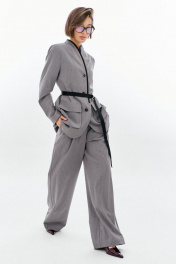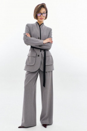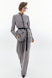 Костюм: жакет+брюки. Жакет прямого силуэта: •цельнокроеная стойка •край борта частично обработан бейкой из отделочной ткани •накладные карманы –«портфели» •съемный пояс •застежка на пуговицы •на подкладке Брюки палаццо: •застежка на гульфик и молнию •по поясу на резинке •в боковых швах карманы