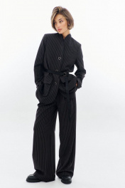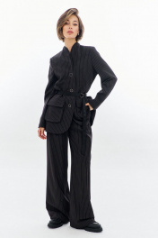 Костюм: жакет+брюки. Жакет прямого силуэта: •цельнокроеная стойка •край борта частично обработан бейкой из отделочной ткани •накладные карманы –«портфели» •съемный пояс •застежка на пуговицы •на подкладке Брюки палаццо: •застежка на гульфик и молнию •по поясу на резинке •в боковых швах карманы