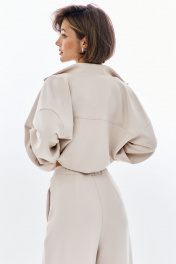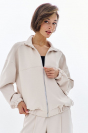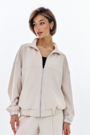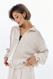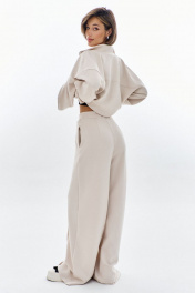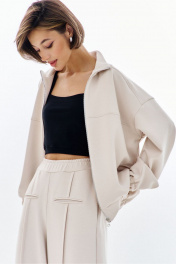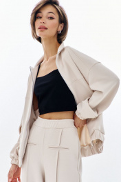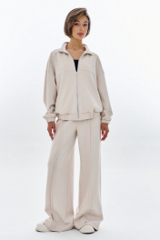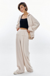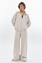 Комплект (бомбер + брюки). Бомбер свободного кроя: - спущенная линия плеча - воротник-стойка - застежка на молнию - фигурные отстрочки по карманам - рукава втачные на резинке Брюки палаццо: - притачной пояс на резинке - по переду кант с карманами-обманками .