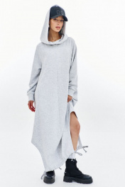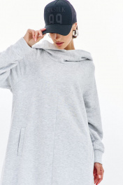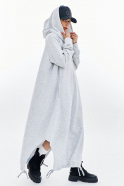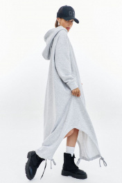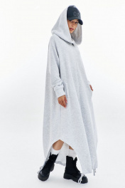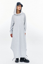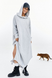 Платье свободного кроя: - горловина с двойным объемным капюшоном - в боковых швах фигурные разрезы - прорезные карманы с листочкой - рукава реглан - по низу декоративный шнур