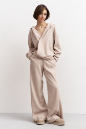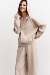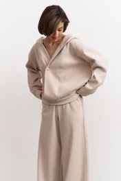 Комплект (джемпер + брюки). Джемпер свободного кроя на запах: - спущенная линия плеча - горловина с двойным объемным капюшоном - застежка на кнопку - рукава втачные Брюки палаццо: - притачной пояс на резинке - карманы с наклонным входом
