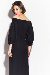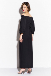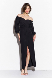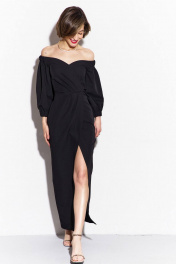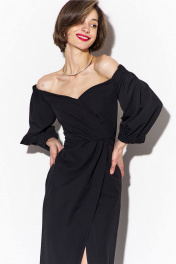 Платье полуприлегающего силуэта: -платье отрезное по линии талии -лиф спинки с талиевыми вытачками -лиф переда и юбка выполнены на запах -платье с открытыми плечами -рукава одношовные, втачные, длиной 3/4.