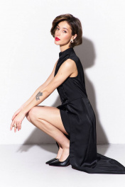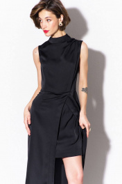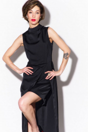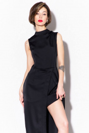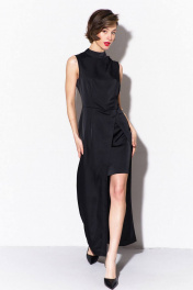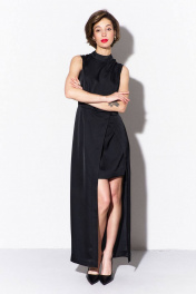 Платье полуприлегающего силуэта: - длина макси - отрезная талия - лиф переда с рельефами, со складками от левого плеча - юбка переда и спинки двойная: нижняя юбка длиной до середины бедра, верхняя – длинная - по переду верхняя юбка с разрезом с левой стороны - по горловине воротник стойка. - платье дополняет съемный пояс с пряжкой.
