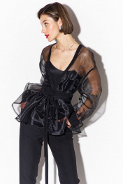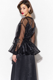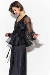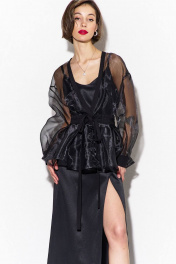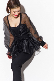 Блузка полуприлегающего силуэта: -длина до линии бедер -блузка с притачным поясом по талии из отделочной ткани -линия плеча спущена, рукава одношовные, втачные, длинные -по поясу притачаны шлевки и вставлен пояс.