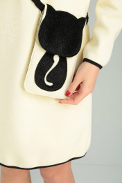 Платье женское 2-х предметное, прямого силуэта. Воротник- стойка отложной на пуговицах, съемный. Плечо спущенное, рукав удлиненный. В локтевой части декоративный элемент- отрезной рукав на пуговице. Сумочка-котик для телефона на застежке-магнит. Ремень-плетеная косичка