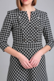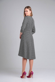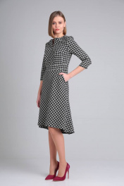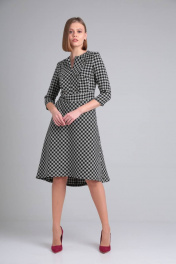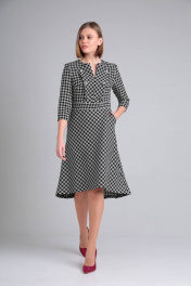 Платье женское прилегающего силуэта с отрезной юбкой-полусолнце. Перед платья с рельефами и нагрудными , с округлой горловиной и имитацией лацконов входящих в пояс. Отрезная линия талии оформлена поясом. В юбке есть боковые карманы. Центр спинки разрезной с потайной молнией до горловины, с выточками. Рукав одношовный прямой. Полуобхват по груди 42р- 44 см, 44р-46 см, 46р-48см, полуобхат по талии 42р-38см ,44р-40 см, 46р-42см, полуобхват по бедрам 42р-47см, 44р-49см, 46р-51см, длина платья 110 см , длина рукава 44 см