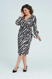 Платье нарядное женское из смесовой ткани с абстрактным печатным рисунком. Уникальный принт, имитирующий полосы зебры, добавит элегантности и пикантности Вашему образу одновременно. Платье полуприлегающего силуэта, отрезное по линии талии. Лиф переда формируется на запах путем завязывания пояса в декоративный бант. Спинка цельная с талиевыми выточками. Юбочная часть платья на запах. Рукав длинный, втачной, по низу - притачные манжеты, застегивающиеся на петлю-пуговицу. Изящное платье с запахом — это вещь, которую точно имеет смысл добавить в свой гардероб, ведь она будет актуальна без привязки к одному сезону. Особый крой платья прекрасно скрывает недостатки, корректируя тем самым силуэт