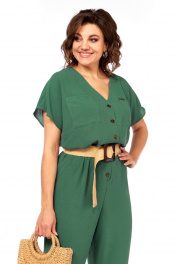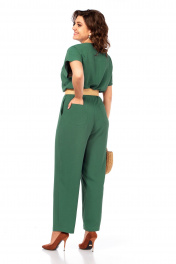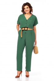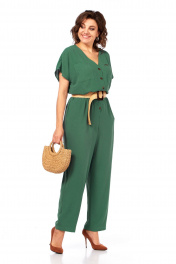 Комбинезон женский свободного силуэта со спущенной линией плеча. По переду центральная застежка на петли-пуговицы. Вырез горловины комбинезона – V-образной формы. В боковых швах – карманы. По линии талии настрочена кулиса с эластичной тесьмой. По переду лифа и задней части брюк настрочены накладные карманы. Комбинезон дополняет съемный пояс-резинка. Эффектный комбинезон сэкономит ваше время на сборы и станет отличной альтернативой платьям. Идеальный вариант для модных и стильных женщин. Уместно смотрится и в городе, и в офисе, и на праздничном мероприятии.