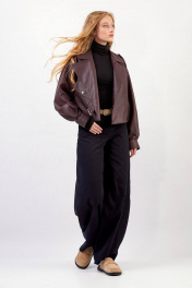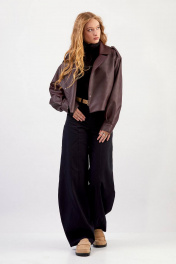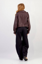 Куртка из эко-кожи: - прямой силуэт - длина чуть ниже талии - воротник пиджачного типа - спущенная линия плеча - погоны с кнопкой - застёжка смещённая на кнопку и пату с кнопками - на правой части переда наклонный карман с клапаном и кнопкой - два внутренних кармана - по спинке средний шов - на подкладке