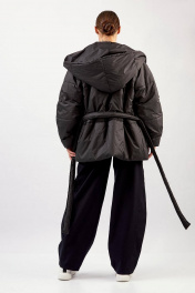 Куртка с капюшоном - прямой силуэт - застёжка на потайные кнопки - передние карманы в горизонтальном шве - рукава-реглан, двухшовные, зауженные к низу - трикотажные манжеты внутри по низу рукава - стёганые перед, спинка, рукава и капюшон - флисовая подкладка переда и спинки - съёмный пояс в комплекте - утеплитель 200 г/м² - температурный режим до –25 °C