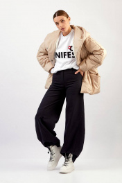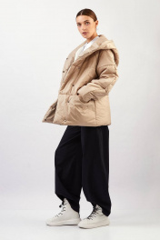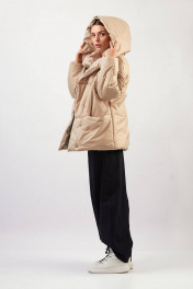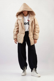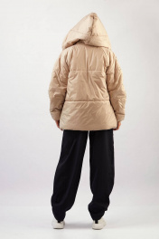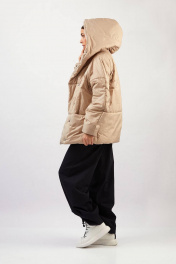 Куртка с капюшоном - прямой силуэт - застёжка на потайные кнопки - передние карманы в горизонтальном шве - рукава-реглан, двухшовные, зауженные к низу - трикотажные манжеты внутри по низу рукава - стёганые перед, спинка, рукава и капюшон - флисовая подкладка переда и спинки - съёмный пояс в комплекте - утеплитель 200 г/м² - температурный режим до –25 °C