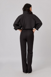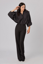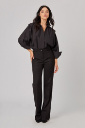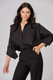 Блуза: - прямой силуэт - воротник - высокая стойка - потайная застёжка на пуговицы - вертикальные складки по переду и спинке - цельнокроеный рукав с манжетой, застежка - пуговица - низ блузы по бокам на резинке.