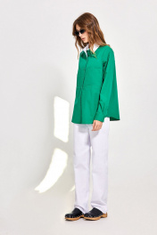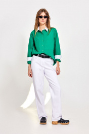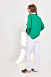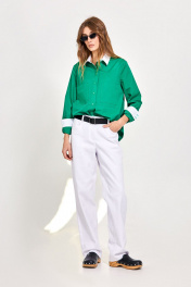 Блуза: - полуприталенный силуэт - отрезная по переду и спинке - рубашечный воротник - застежка на пуговицы - рукав втачной с манжетой - фигурный низ - нижняя сторона манжет, планок и стойки воротника белого цвета - накладные карманы
