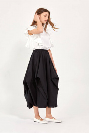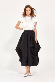 Блуза: - прямой силуэт - спереди и на спине прямые рельефы, в которые вставлены двухслойные воланы -спинка со средним швом, сверху которого разрез и застёжка на пуговицу и навесную петлю -воротник стойка - проймы обработаны бейкой