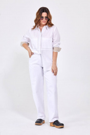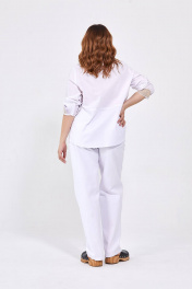 Блуза: - полуприталенный силуэт - отрезная по переду и спинке - рубашечный воротник - застежка на пуговицы - рукав втачной с манжетой - фигурный низ - нижняя сторона манжет, планок и стойки воротника цвета тёплый беж - накладные карманы