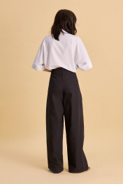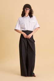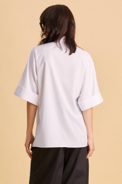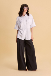 Блуза: - прямой силуэт - воротник рубашечный - потайная застежка на пуговицы - цельнокроеные рукава средней длины с притачными манжетами - спереди больние накладные карманы с клапанами