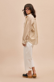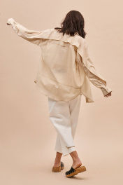 Блуза: - прямой силуэт - рубашечный воротник - потайная застежка на пуговицы - спущенная линия плеча - широкая складка по спинке и задней части рукавов - горизонтальный подрез на спинке ниже линии талии - манжеты с застежкой на пуговицу - фигурная линия низа