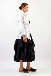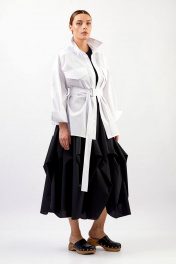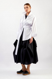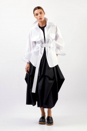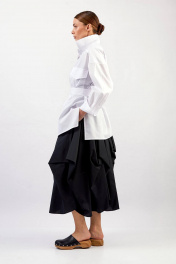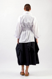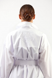 Блуза: - полуприлегающий силуэт - спущенная линия плеча - спереди фигурные карманы с фигурными клапанами - на спинке переходящая на перед кокетка с вышивкой; от кокетки вниз — бантовая складка - застёжка: потайная планка с пуговицами - рукава с манжетами и тремя складками по низу - воротник: рубашечный - разрезы в боковых швах - в комплекте пояс из основной ткани с пряжкой-полукольцом