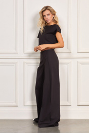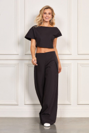 Брюки: - расклешённого силуэта - линия талии обработанна обтачкой - без боковых швов и карманов - спереди застроченные складки - застёжка на потайную молнию сзади