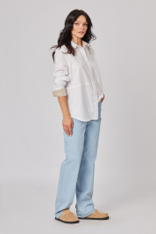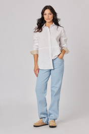 Джинсы: - прямой силуэт - застежка: молния с кнопкой - на задней части брюк кокетка - боковые карманы с хольнитенами - сзади накладные карманы со скругленными углами и хольнитенами - низ с необработанным краем - Внимание! Корректировать длину после первой стирки.