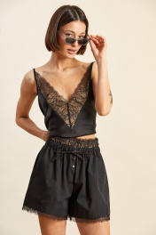Шорты: - силуэт свободный; - в боковых швах карманы; - спереди в среднем шве имитация застёжки с тремя пуговицами; - пояс с резинкой и тонкими завязками; - внутри второй пояс большей ширины, из кружева на подкладке телесного цвета, также с резинкой; - по низу широкая подгибка с кружевом.