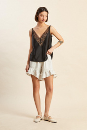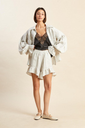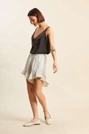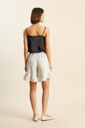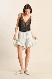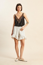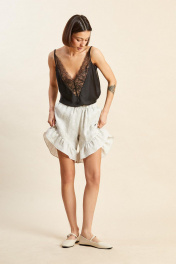 Шорты: - свободный силуэт; - в боковых швах карманы; - сзади длиннее, спереди короче; - пояс на резинке; - по низу оборки.
