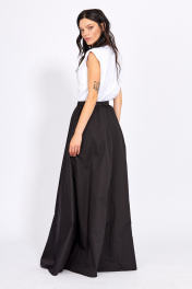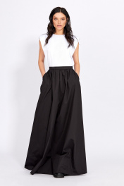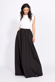 Джемпер из тонкого трикотажа: - приталенный силуэт - расширенная линия плеча с плечевыми накладками Юбка: - расширенный силуэт - застежка сзади на потайную молнию и пуговицу - по линии талии сборка - притачной узкий пояс - карманы в боковых швах - низ обработан широкой притачной обтачкой - на подкладке
