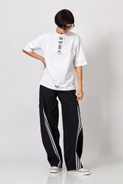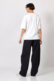 Футболка: - ткань: футер двухнитка - прямой силуэт - спущенная линия плеча - по горловине планка из основного материала, швы закрыты киперной лентой - спереди и на спинке печать