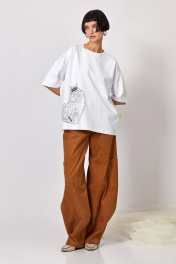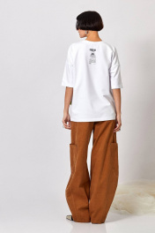 Футболка: - ткань: футер двухнитка - прямой силуэт - спущенная линия плеча - по горловине планка из основного материала, швы закрыты киперной лентой - спереди и на спинке печать
