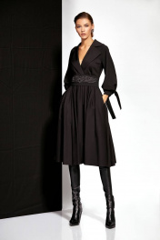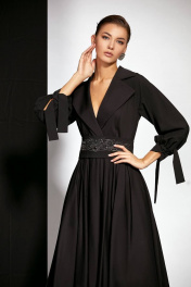 Платье с воротником пиджачного типа, с полочкой на запах. Глубокий мысообразный вырез, рукава «реглан», которые мягко драпируются, благодаря тому, что выполнены из ткани-компаньона. Низ рукавов собран в манжет, завязывающийся на бант. Юбка платья в форме пышного «солнца», уложенного при помощи складок по линии талии. Заканчивает образ пояс с вышивкой, расшитый камнями и стразами. Размерный ряд: 42 44 46 48 50 Замеры готового изделия: Обхват по линии груди: 42 44 46 48 50 86 90 94 98 102 Обхват по линии талии: 42 44 46 48 50 74 78 82 86 90 Обхват по линии бедер: 42 44 46 48 50 92 96 100 104 108 Длина изделия: 98 см.