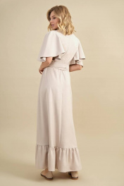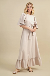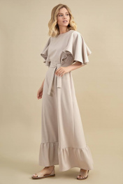 Платье-макси прилегающего силуэта, отрезное по линии талии. По лифу платья - рельефы, в которые вставлены воланы. Юбка расширена, низ с притачным воланом, собранным на сборку. Спинка разрезная с застежкой на потайную молнию. Талия подчеркнута съемным длинным поясом. Одежда, выполненная из смесовых тканей, отличается высоким качеством и долговечностью. Лен - экологичный материал растительного происхождения, который отличается высокой износостойкостью, хорошо отводит влагу, пропускает воздух и не вызывает аллергических реакций. Полиэстер и эластан добавляют изделию прочность, упругость, способность сохранять форму и первоначальную яркость цвета.