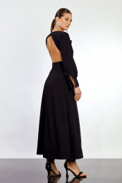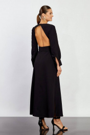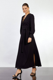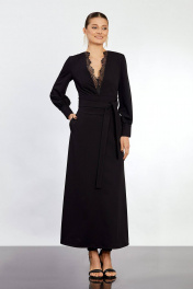 Утонченное платье длины макси: - приталенный силуэт - v-образный вырез, задекорированный кружевом - по переду нагрудные вытачки - открытая спина с застежкой на молнию в среднем шве и петлю, пуговицу у горловины - рукав длинный, низ на сборке, с манжетой и застежкой на петлю, пуговицу - фигурный съемный пояс с прорезью - по бокам разрезы, чуть выше колена - в боковых швах карманы - длина макси