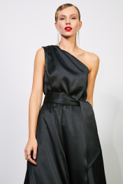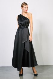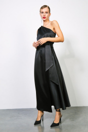 Платье из атласа: - приталенный силуэт - асимметричный вырез верха с драпировкой на одно плечо - отрезное по линии талии, с резинкой - съёмный пояс с фигурными концами - спереди отлетная деталь, имитирующая запах - боковая застежка-молния - на подкладке.