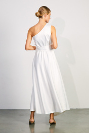 Платье из атласа: - приталенный силуэт - асимметричный вырез верха с драпировкой на одно плечо - отрезное по линии талии, с резинкой - съёмный пояс с фигурными концами - спереди отлетная деталь, имитирующая запах - боковая застежка-молния - на подкладке.