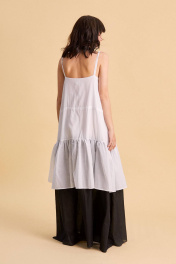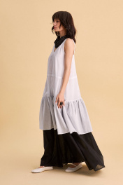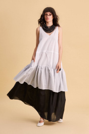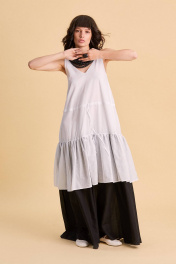 Платье: - расклешенный силуэт - с завязкой в кулиске по линии талии - по низу два волана разной длины со сборкой - v-образный вырез горловины - цельнокроеные бретели - в боковых швах карманы