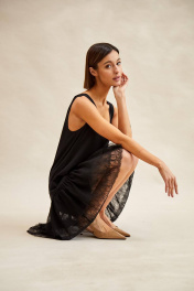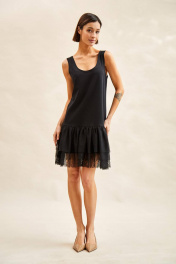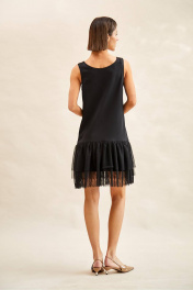 Платье: - слегка расклешенное книзу; - зауженная линия плеча; - овальный вырез горловины; - ниже линии талии отрезное с тремя оборками из сетки, нижняя оборка с кружевом.