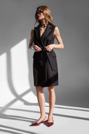 Жилет: - полуприталенный силуэт - пиджачный воротник - рельефы по переду и спинке - боковые карманы - застежка на потайные кнопки - пояс из основной ткани в комплекте - на подкладке.