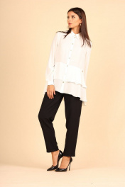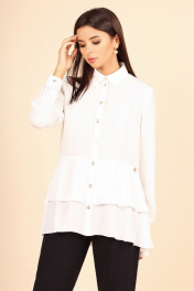 Блузка Силуэт: свободный Тип ткани: креп-шифон стрейч Тип воротника: отложной воротник рубашечного типа Длина изделия: по среднему шву спинки - 74 см, по переду - 69 см Длина рукава: втачной - 61 см Вид застежки: планка на петли-пуговицы спереди