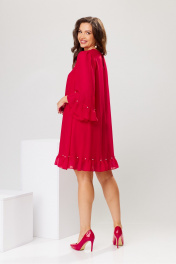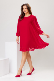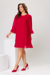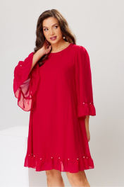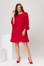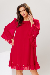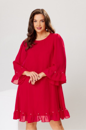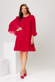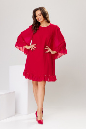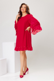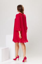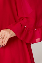 Платье женское расширенного силуэта, длиной до колена, относится к нарядной торжественной одежде. Перед цельнокроенный с двумя талиевыми вытачками. Спинка цельнокроенная. Горловина круглая, обтачная, без воротника. На спинке разрез обтачной "капелька", фиксирующийся на одну навесную птлю и одну пришивную пуговицу. Низ платья с притачной рюшей с легкой сборкой. Рукав втачной, одношовный, с 43-мя складками по окату, расширенный к низу с притачной рюшей с легкой сборкой. Шов притачивания рюши к рукаву и к низу декорируется контрастными пришивными бусинами. Платье на подладке. Платье без плечевых накладок. Длина спинки 90.5см. Длина рукава 51см.